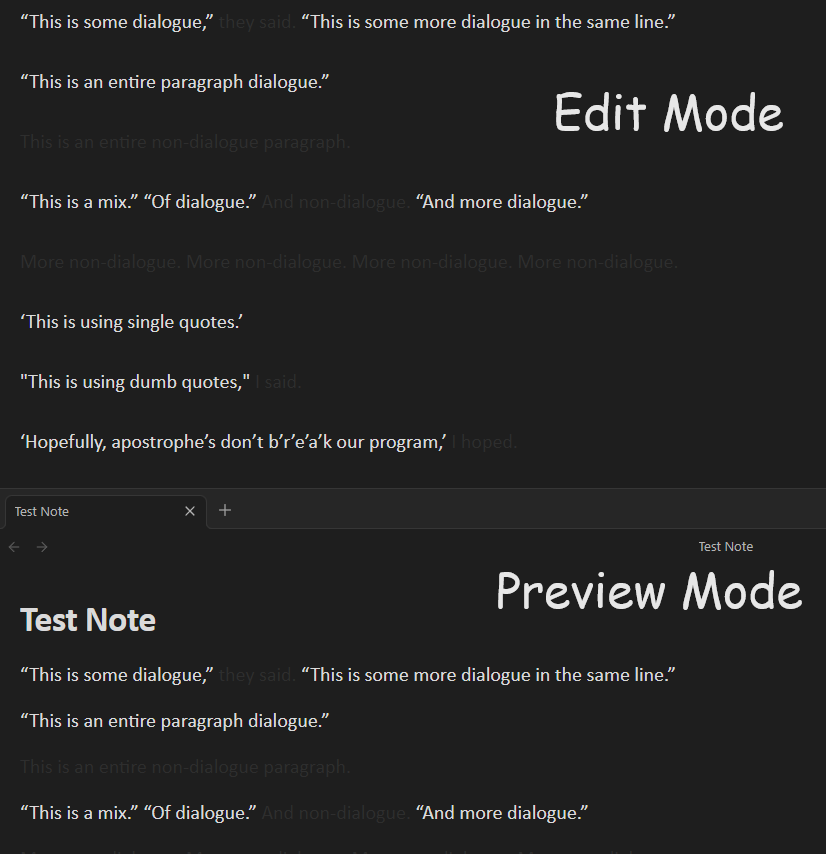 Obsidian Dialogue Mode is a plugin designed to enhance your writing experience in Obsidian by fading out non-dialogue text, making it easier to focus on the most relevant parts of your writing.