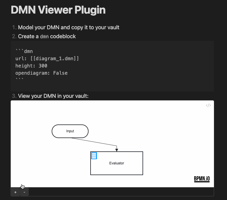 This plugin lets you view DMNs interactively in your Obsidian notes. The viewer is based on the dmn-js library. If you want to evaluate/execute your DMNs inside your note, look at the DMN Eval Plugin.