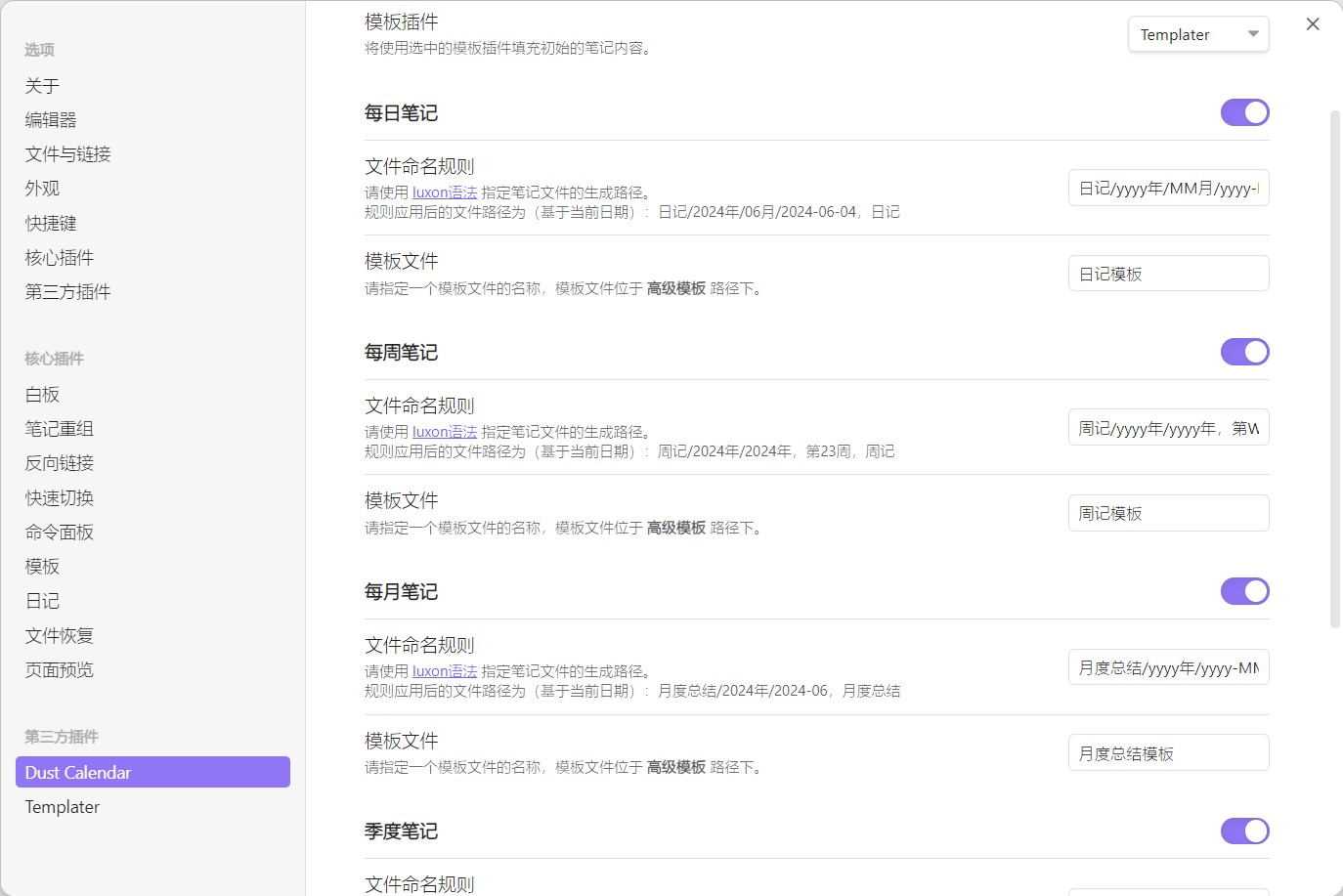 除此之外,Dust Calendar 支持与一些模板插件进行联动,在创建笔记的时候自动应用模板。为了使用这项功能,我们需要选择指定一款模板插件,并为需要使用模板功能的周期性笔记配置模板文件。目前,Dust Calendar 支持 Obsidian 核心插件中的模板和 Templater 。