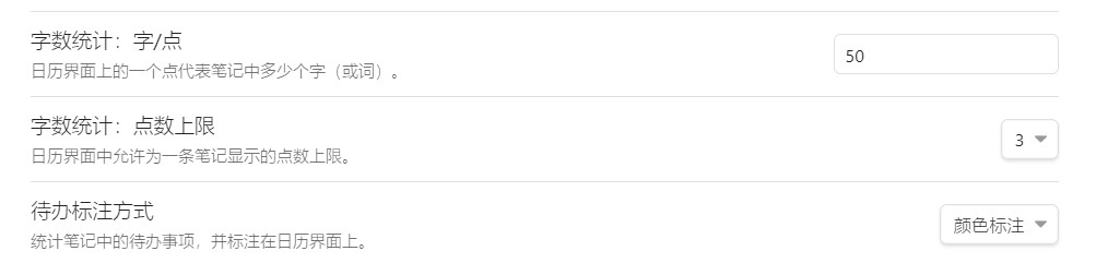Dust Calendar 会统计笔记中的字数和待办,并将这些信息以小圆点或小圆孔的方式标注在与笔记关联的日历组件上。在插件设置中,允许设置多少字标注一个点以及点数上限,还可以设置待办的标注方式。