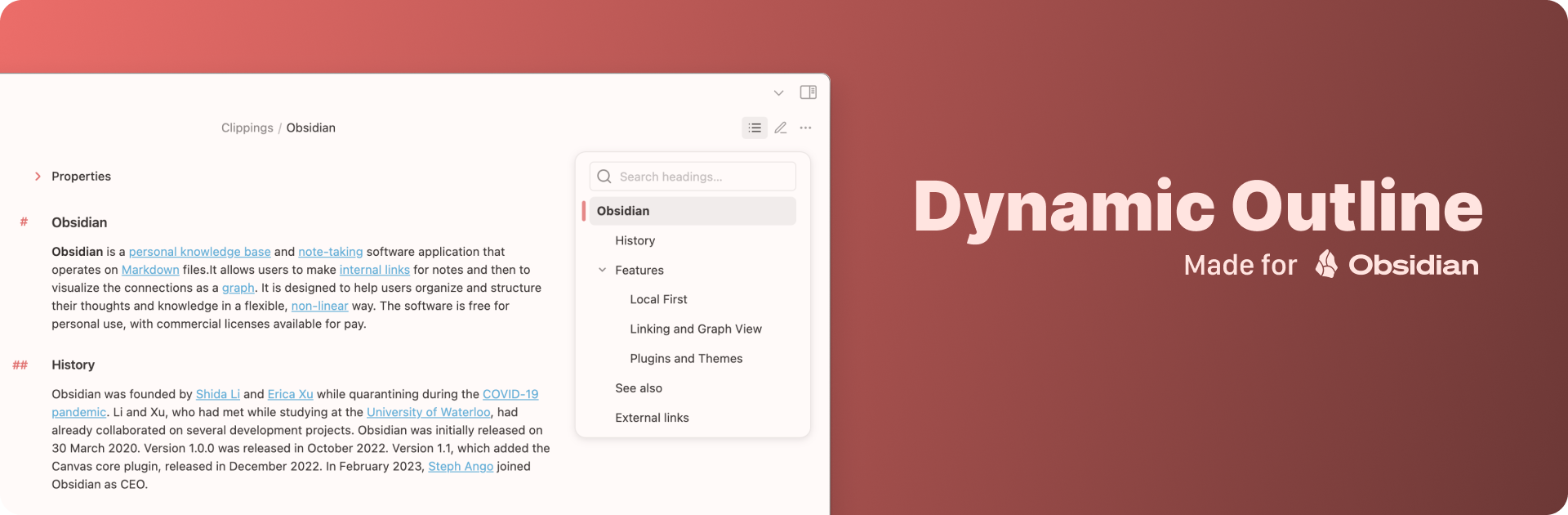 Click the icon in the top right of your current note to instantly open the Dynamic Outline and get a clear view of your note's structure. For an even faster workflow, you can bind the plugin command to a hotkey.