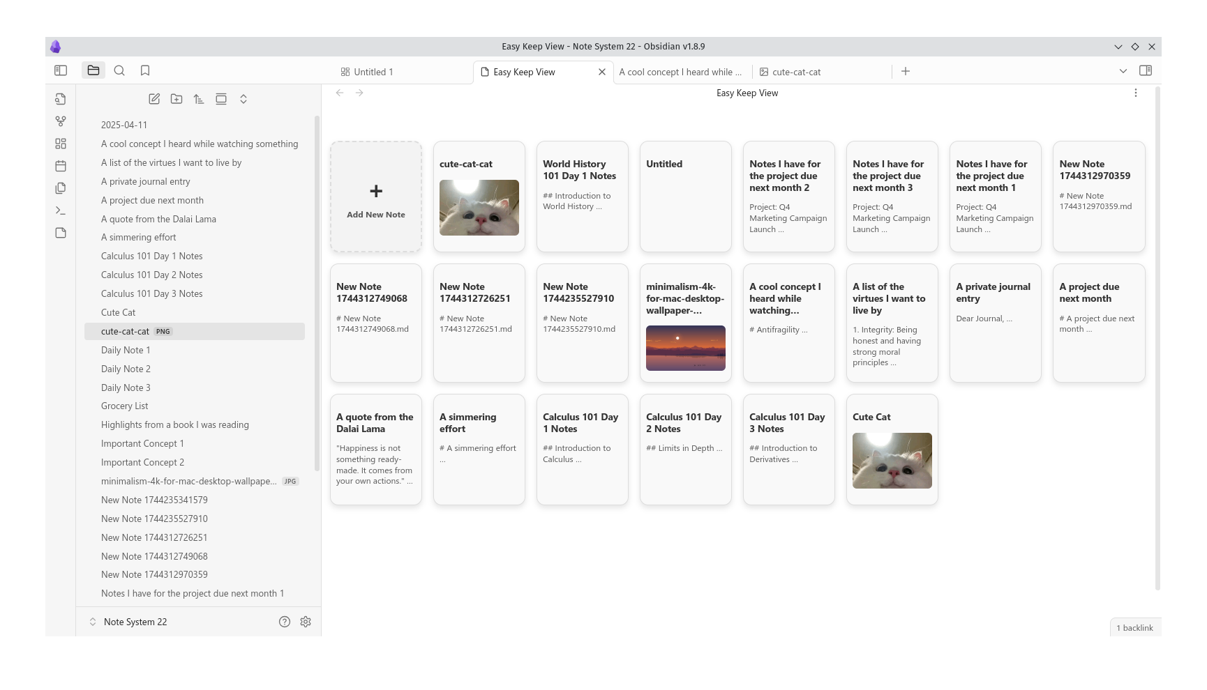 Easy Keep View is a plugin that mimics the Google Keep interface, allowing you to view and manage your notes with image thumbnails and excerpts.