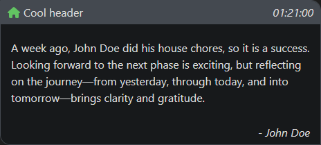 A week ago, [author:: John Doe] did his [icon:: house] chores, so it is a [status:: success]. Looking forward to the next phase is exciting, but reflecting on the journey—from yesterday, through today, and into tomorrow—brings clarity and gratitude.