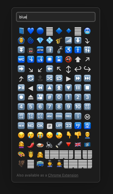 keyboard shortcut->search phrase->enterand done. - Because this plugin shows a 2d grid of emoji, built two-dimensional arrow key support for navigating.