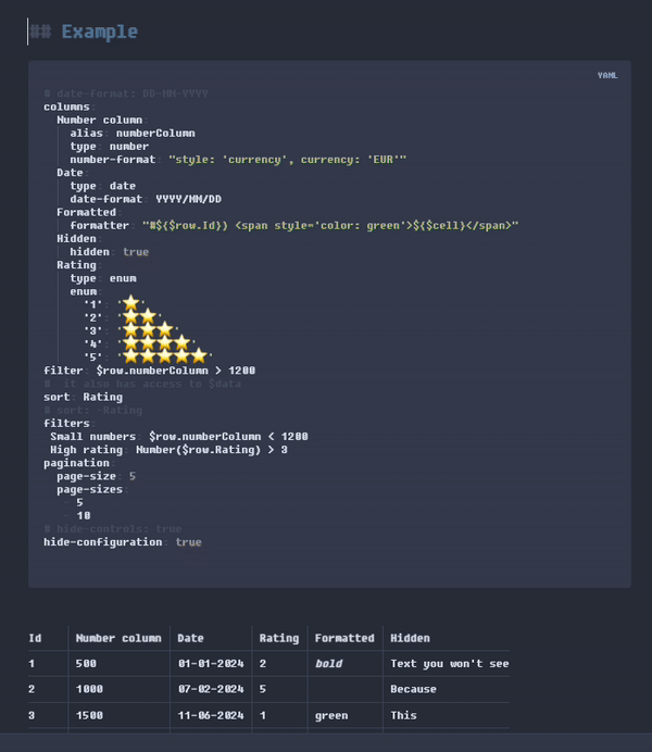 | Id | Number column | Date | Rating | Formatted | Hidden | Boolean | |----|---------------|------------|--------|--------------|--------------------| -------- | | 1 | 500 | 01-01-2024 | 2 | _**bold**_ | Text you won't see | | | 2 | 1000 | 07-02-2024 | 5 | | | no | | 3 | 1500 | 11-06-2024 | 1 | green | | yes | | 4 | 10000 | 05-01-2024 | 4 | ~~strike~~ | | whatever |