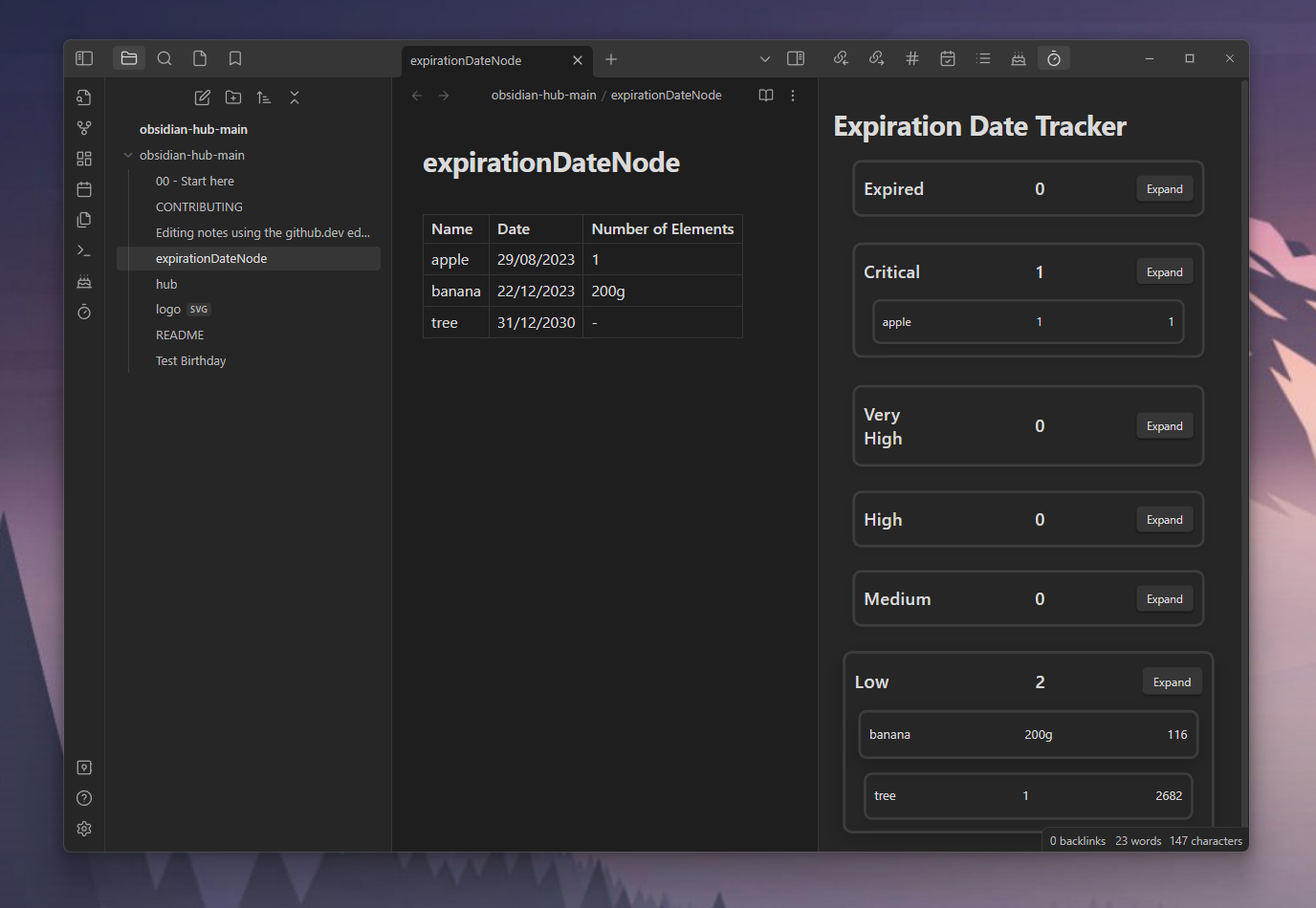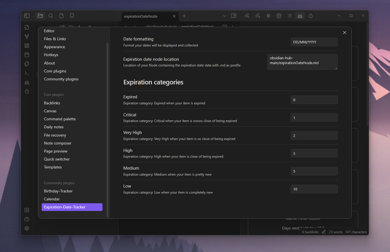 You can set a date formatting. The default is: DD/MM/YYYY. This is needed to collect your dates and display them. Also you can set the location of the file containing the expiration data. This must include .md as postfix. The default value is: expirationDateNode.md.