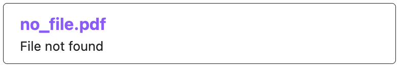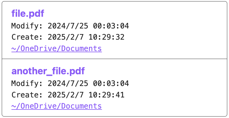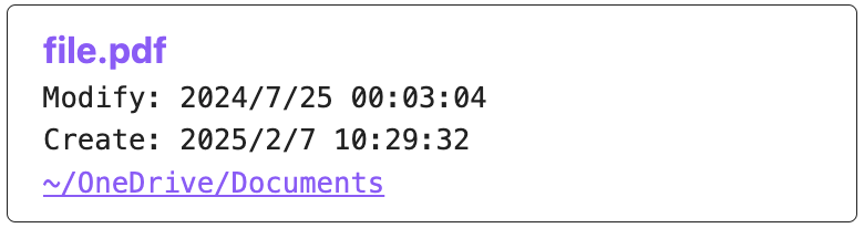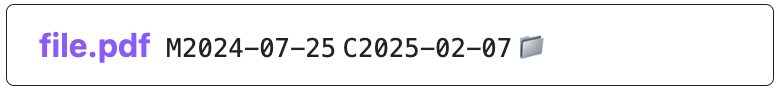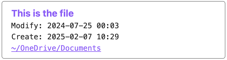 This plugin add two Markdown codeblock languages ef and extfile, which are equivalent. When provided with a file name or partial file path, this plugin will try to locate the given file in the file system, rooting from paths as given in the setting of this plugin. If a file is found, this plugin will render a card UI with its file name, modified and created times, and containing folder path. Both the file name and the containing folder path are clickable, opening the file and the folder using OS default applications.
