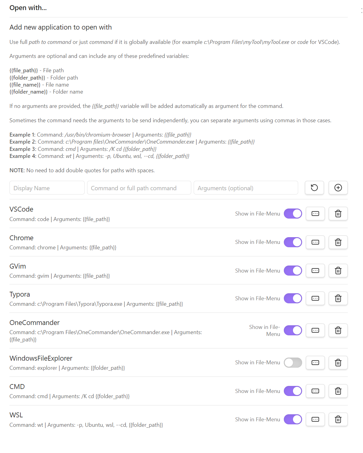 - Open With: Open files or folders using custom commands.