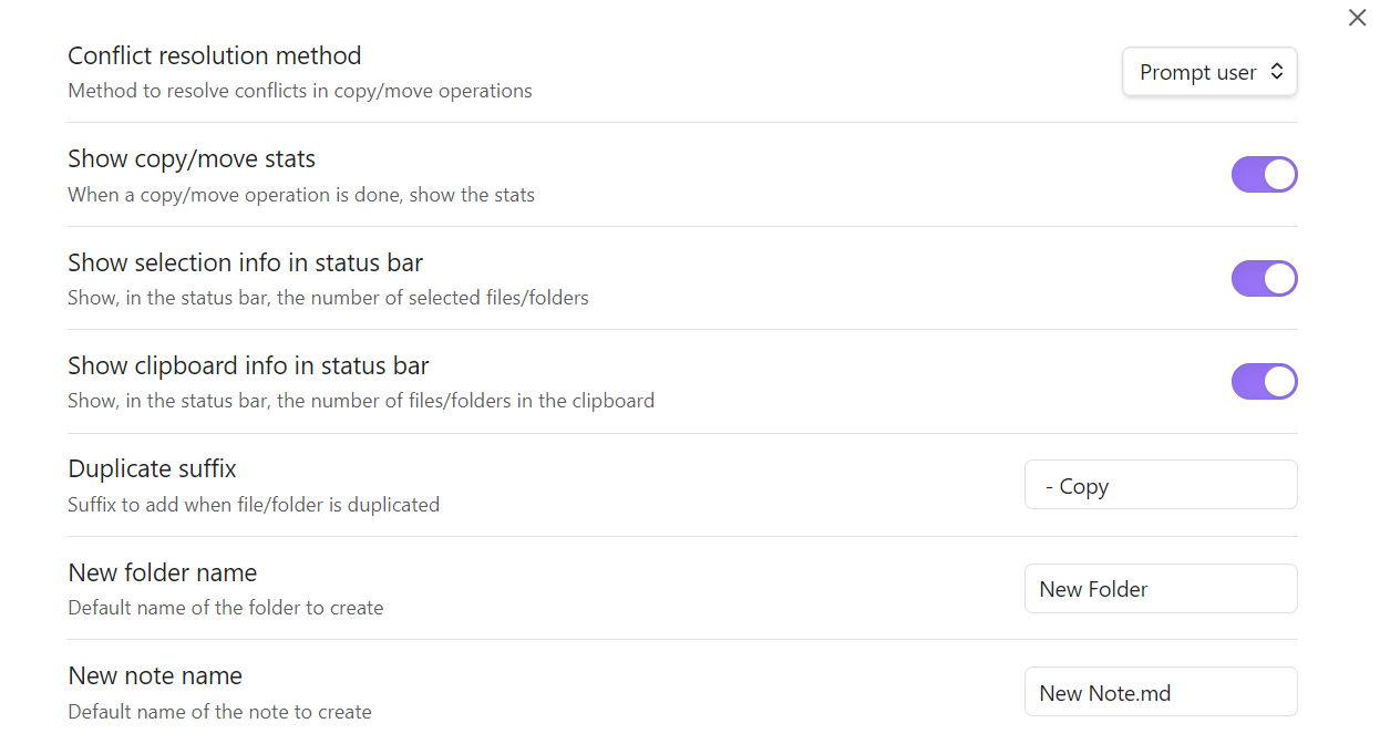 This plugin enhances the Obsidian File Explorer by introducing essential file management features. It adds several new commands to interact with the File Explorer, allowing users to bind hotkeys for efficient keyboard-only file management.