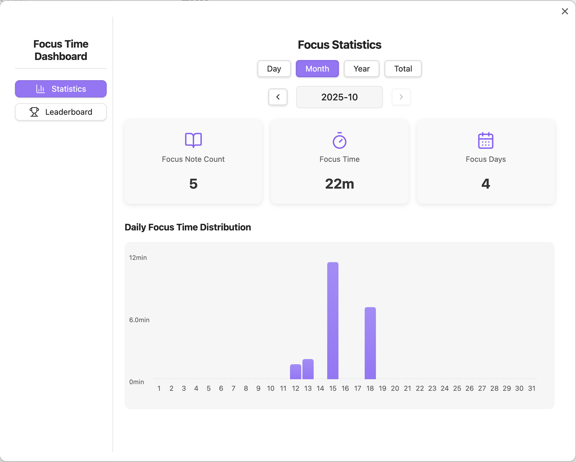 - Focus Time Leaderboard: View the top 10 notes ranked by total focus time.