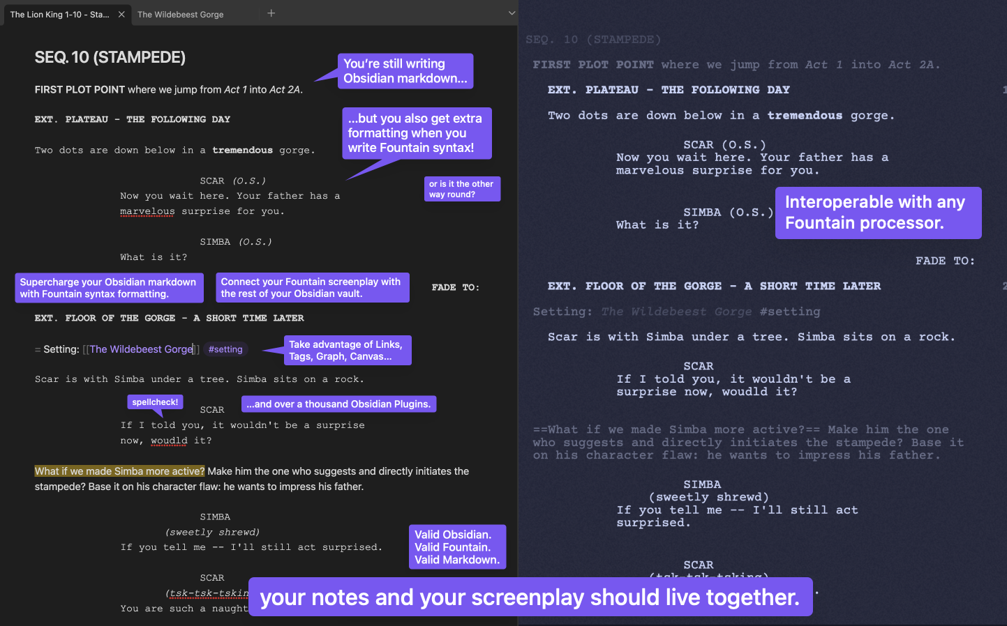 Effortlessly incorporate other Obsidian plugins, and external screenplay tools and apps!