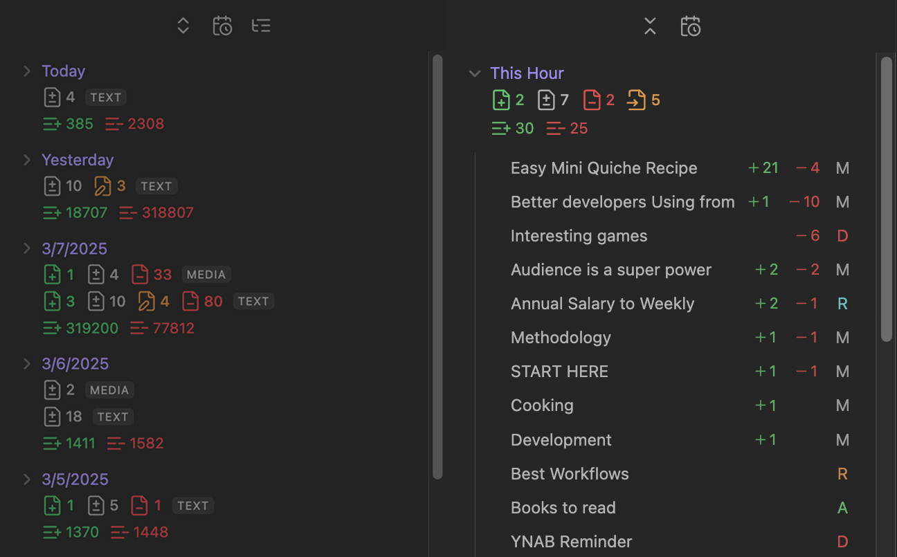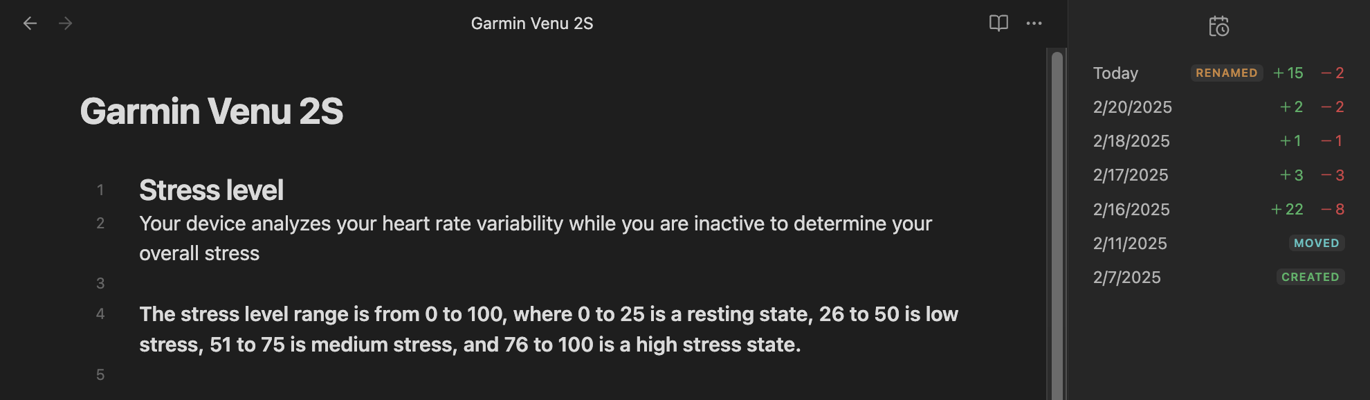 - Shows the count of added and deleted lines for all previous versions of the active note.