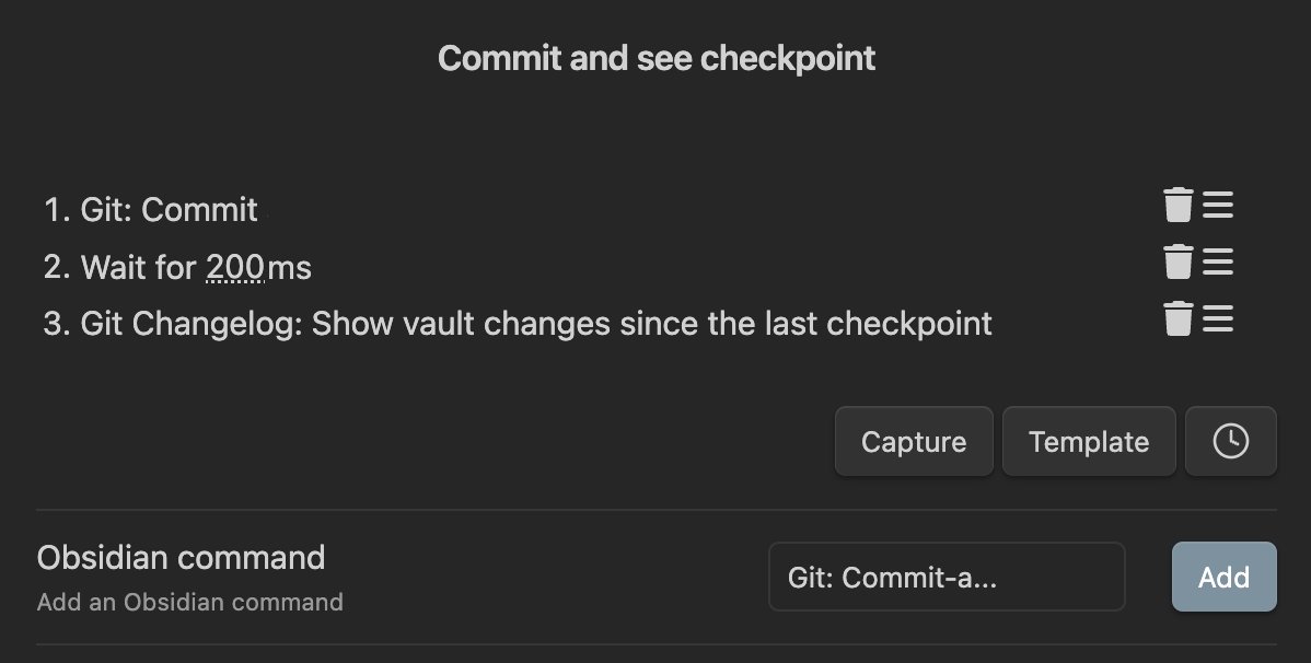 Show vault changes since the last checkpointcommand to open a temporary view that shows all changes that happened since the last checkpoint (meaning: the last time you ran this command and approved the shown changes by creating a new checkpoint). -