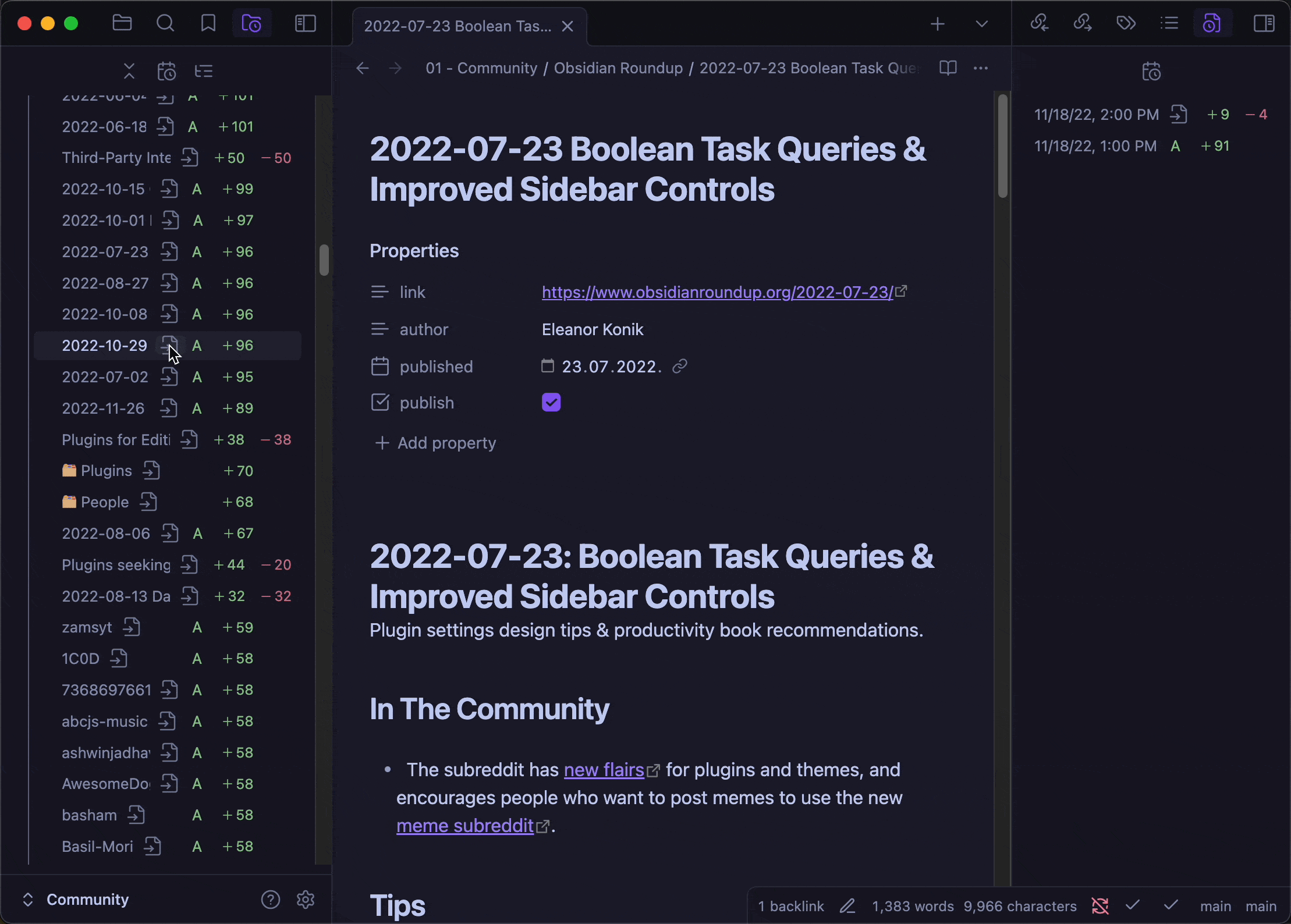 Uses Git to display dynamic vault and file changelogs in the sidebar, useful for spotting data loss.