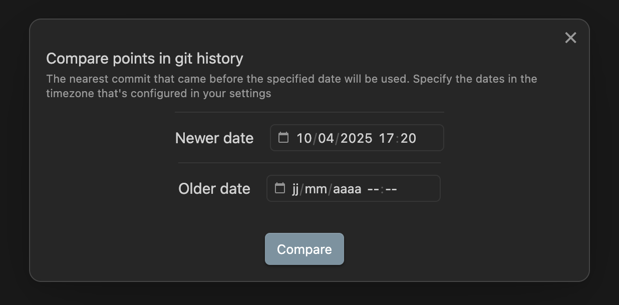 Compare two vault states in historycommand to compare any two points in the vault's Git history. -