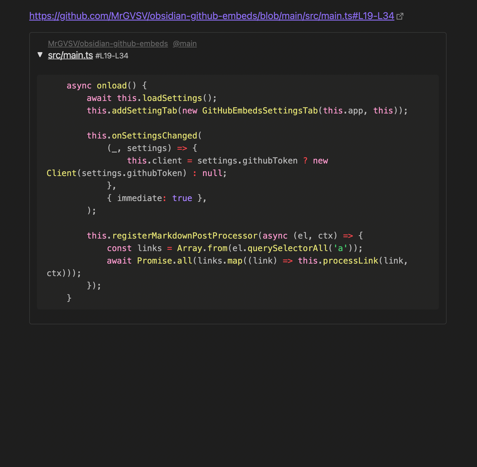 Embed GitHub issues, PRs, and code snippets directly in Obsidian.