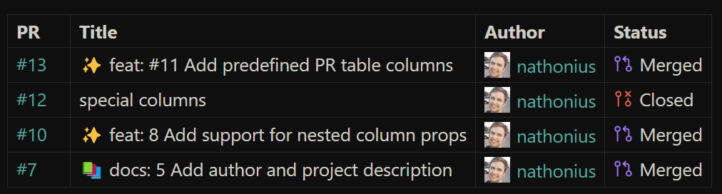 You can also include a table with results from a search query using a github-query codeblock. For example:
