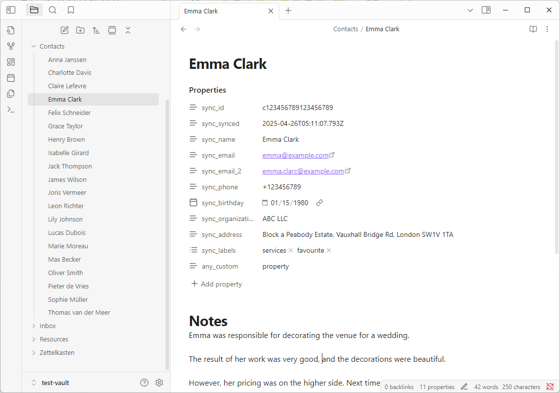 Each contact becomes a separate note with YAML frontmatter for metadata and free-form text for your notes.