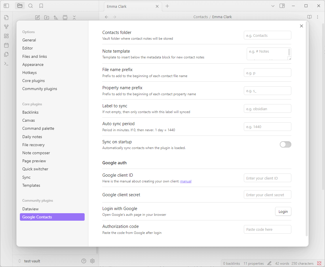 To sync your contacts, youβll need a valid Google Access Token that grants access to the People API. Follow the steps below to obtain the Client ID and Client Secret, and to configure your account so you can retrieve the necessary Authorization Code for the Obsidian plugin.