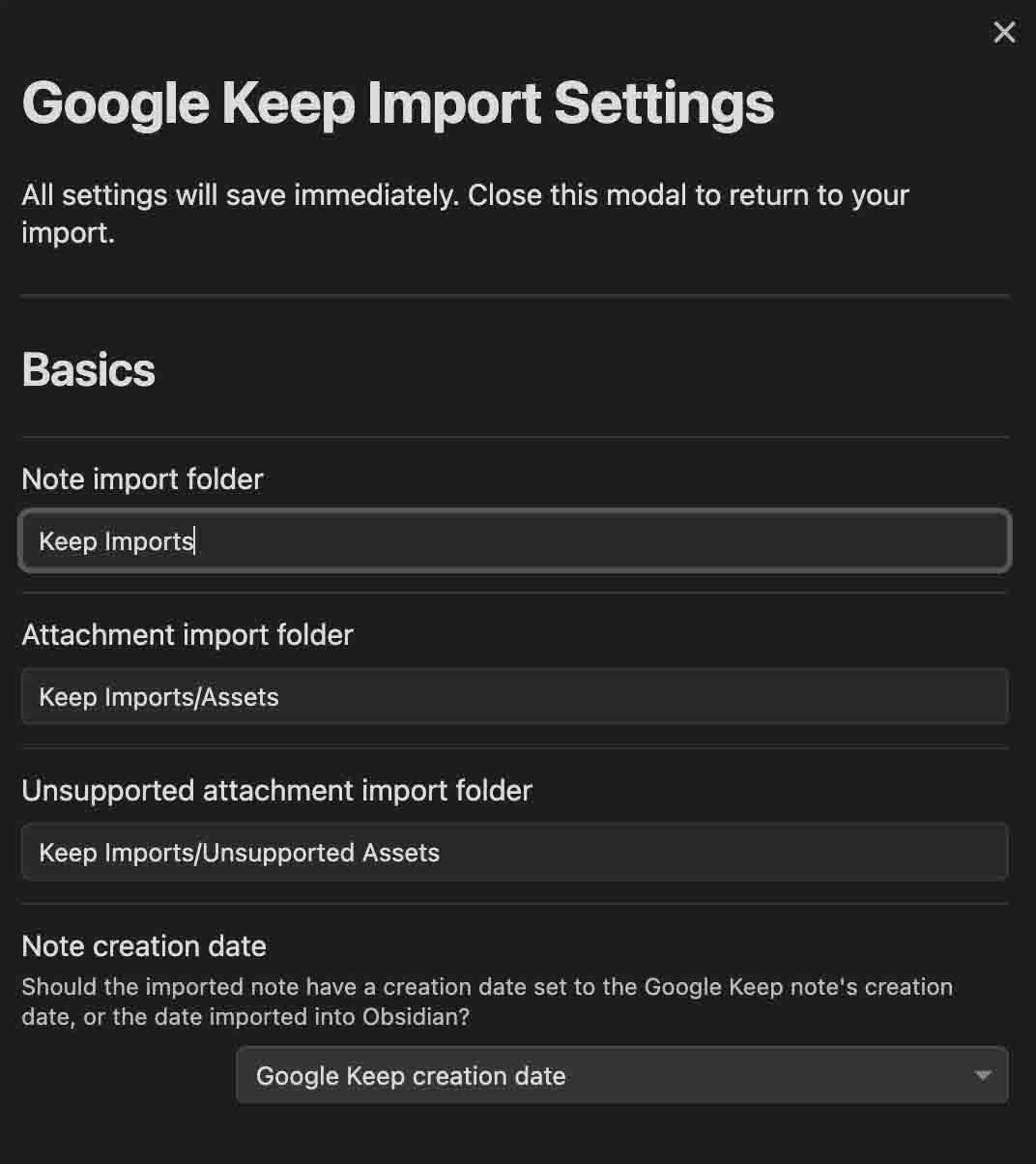 - Note creation date: Defines which date should be used as the 'created on' date for each new Obsidian note; The date of Obsidian import, or the original Google Keep creation date.