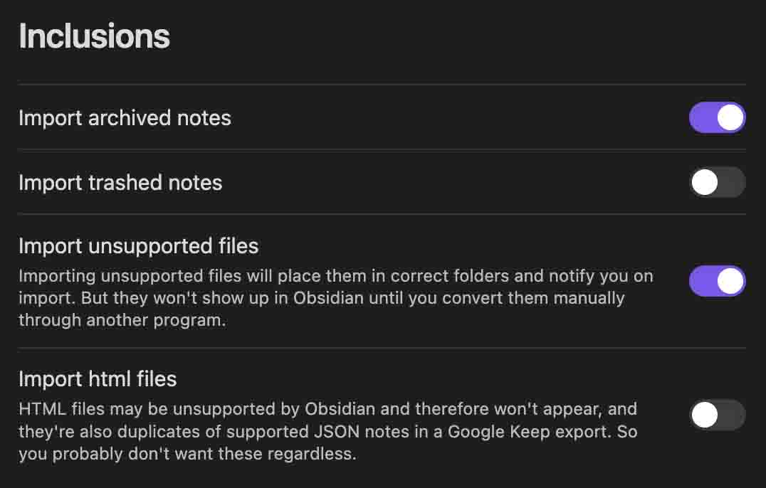 - Import html files: Unsupported (and html files) aren't imported by default as they will usually be invisible in Obsidian. HTML files from Google Takeout exports are also duplicates of other files so they do not need to be imported.