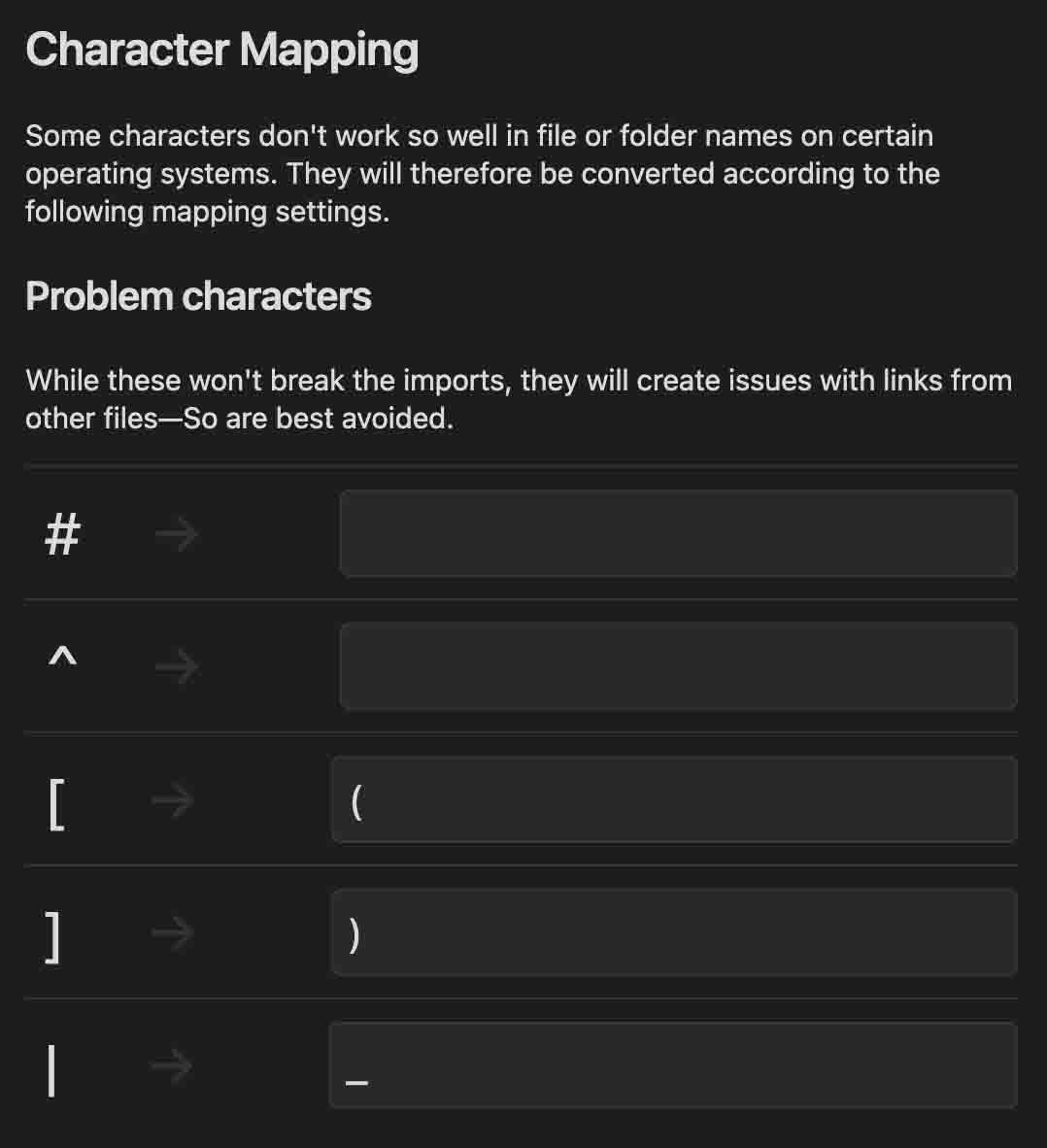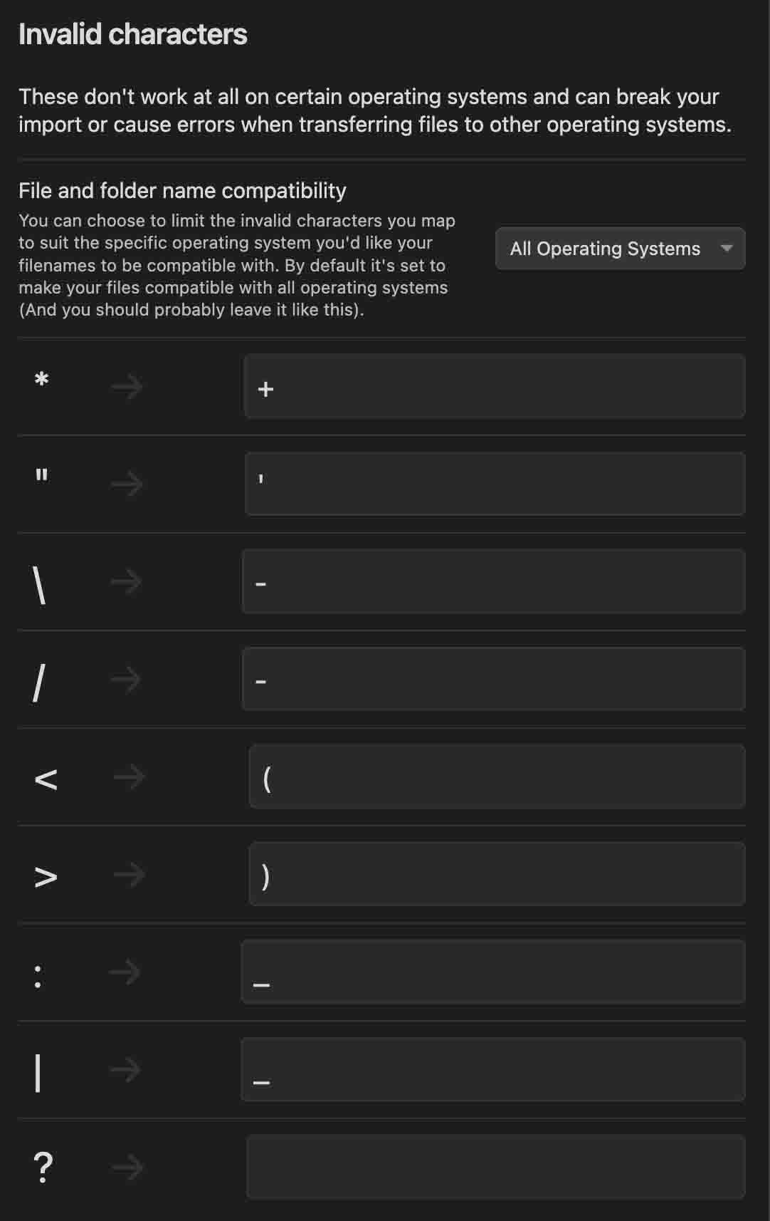 Allows mapping any characters in titles to valid characters for use in your notes filenames. This is set to make files valid for all operating systems by default.