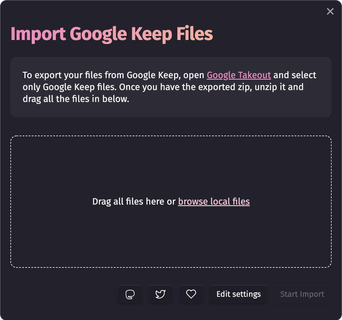 CMD+Pand select theGoogle Keep Importaction. - In the modal that opens, drag in all the unzipped files and follow the instructions import the files.