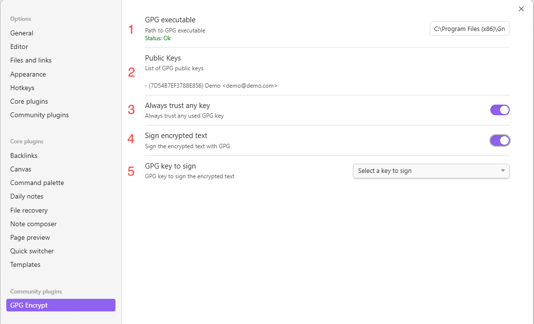 - If you mark point 4 as true, point 5 will be activated with a drop-down list of the keys in your Operating System, you must select one with which it has its respective private key, this will mean that every time you go to encrypt a text, this will also be signed with that private key.