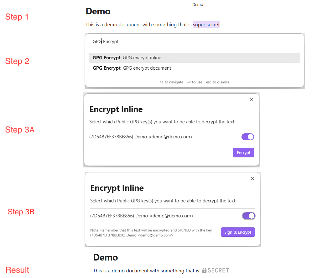 Step 1 - In a note you have, select the text you want to encrypt (For inline encryption) and open the command palette Step 2 - In the command palette, look for the "GPG Encrypt" option, here you will have the option to encrypt inline (The block of text that you selected in step 1) or to encrypt the entire document. Step 3A - A pop-up window will appear with the list of GPG keys available in your Operating System, select one or more recipient keys that you can decrypt this text later (It is mandatory to select at least one)