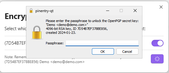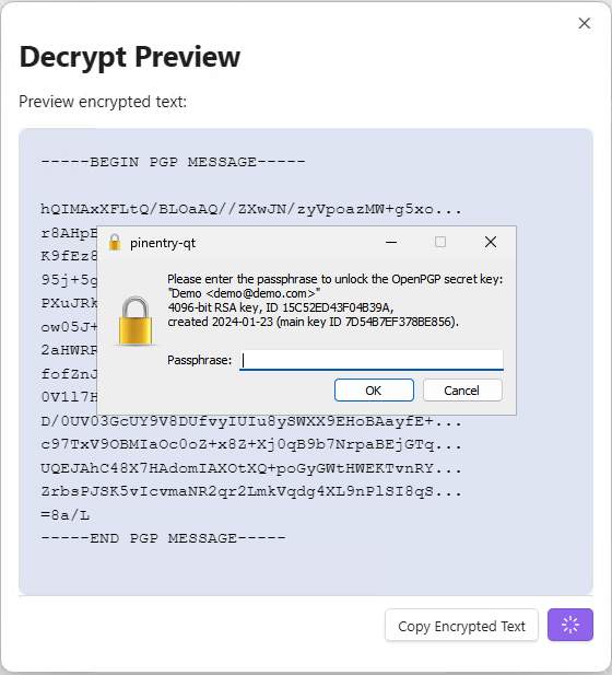 Step 3 - By clicking on the "Decrypt" button, the decryption process will begin, this may prompt you for your phasphrase