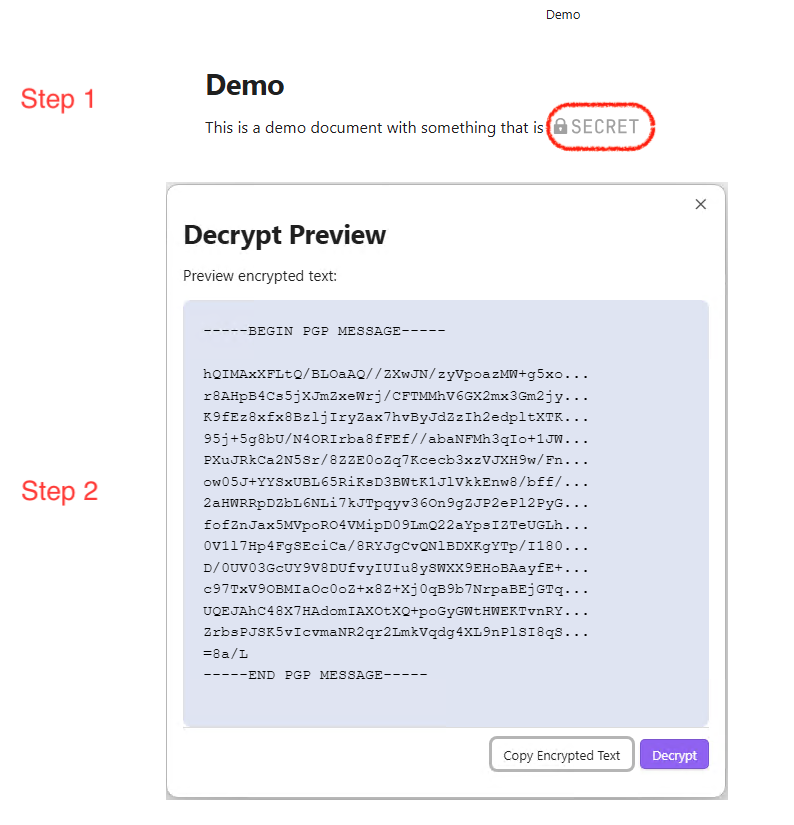 Step 1 - The first step is from a note with an encrypted secret, click (like a button) on the image that says secret Step 2 - This will open a modal with the message encrypted in GPG, if you want to copy the encrypted message, you can do so using the "Copy Encrypted Text" button, you can also decrypt the message with the "Decrypt" button