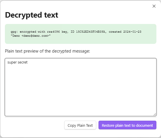 Step 4 - Once the decryption process has finished, you will have a green message with technical information about the process, but you will also have a text area with the decrypted text, here you can copy it using the "Copy Plain Text" button or directly restore the decrypted text to the note using the "Restore plain text to document" button