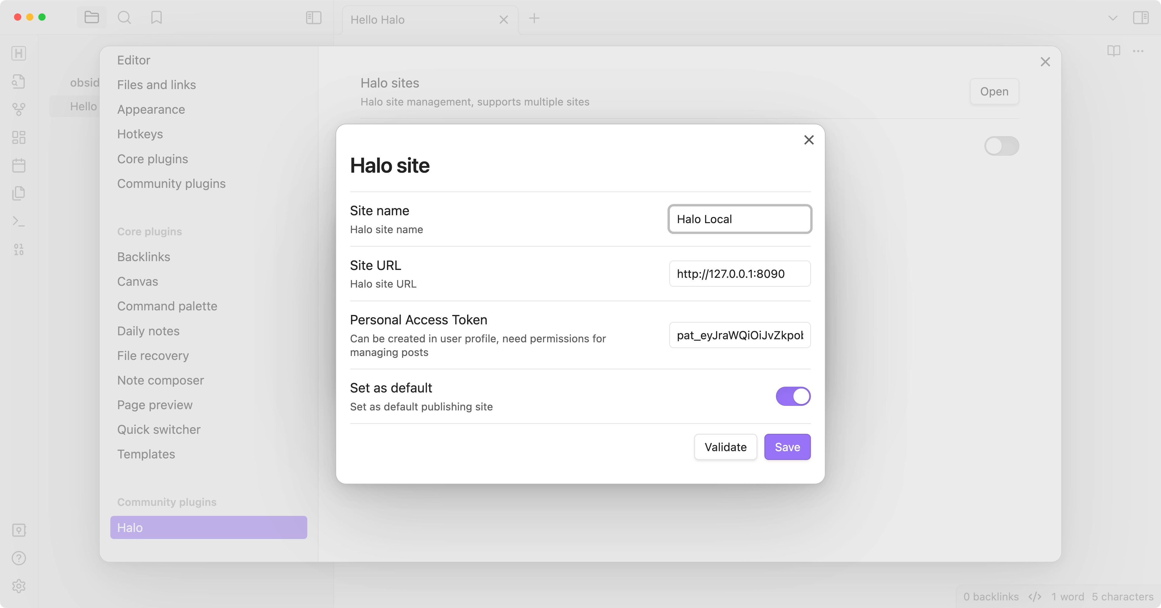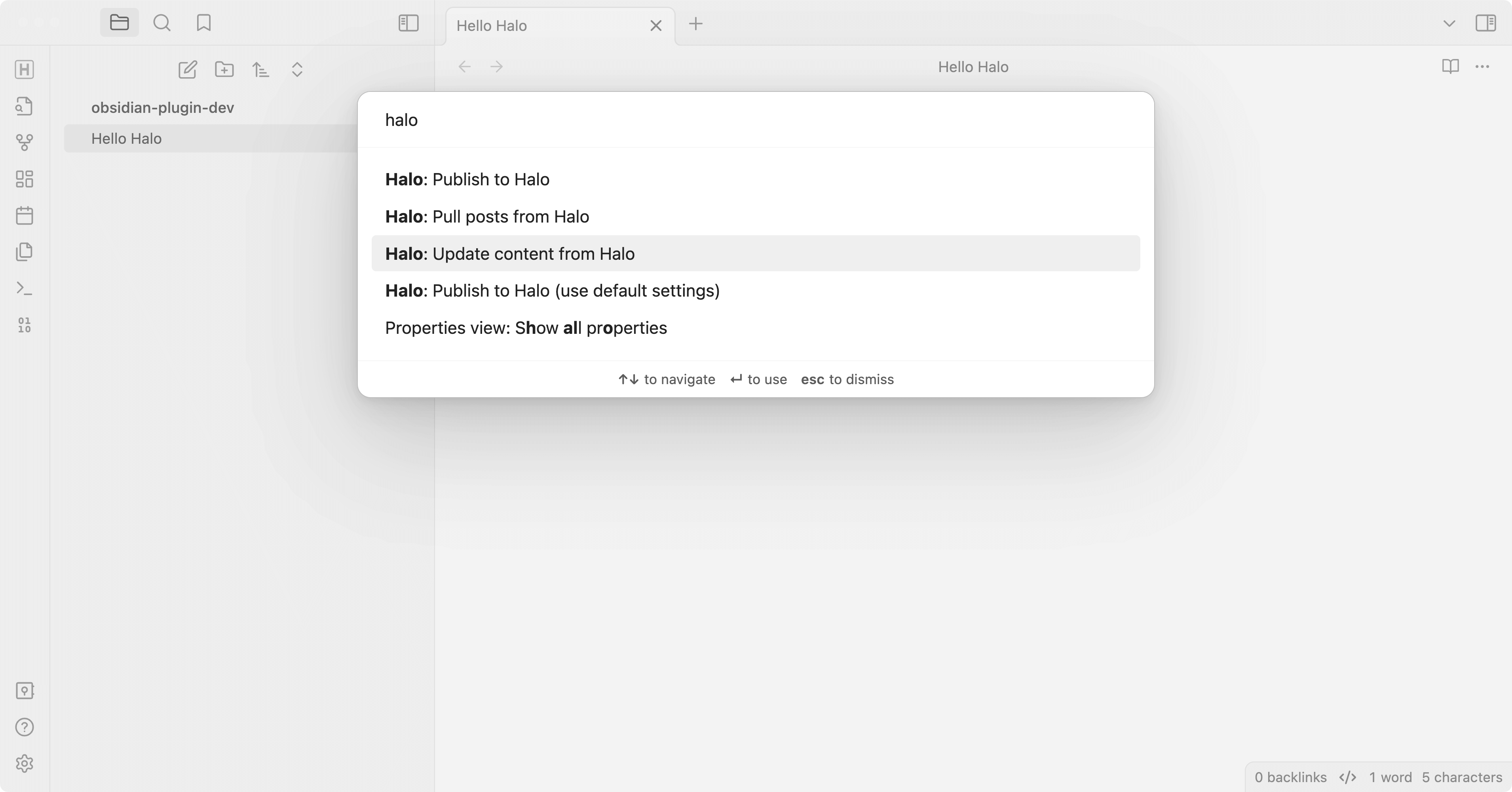 - Halo: Publish to Halo (use default settings): publish the current note to the default site.