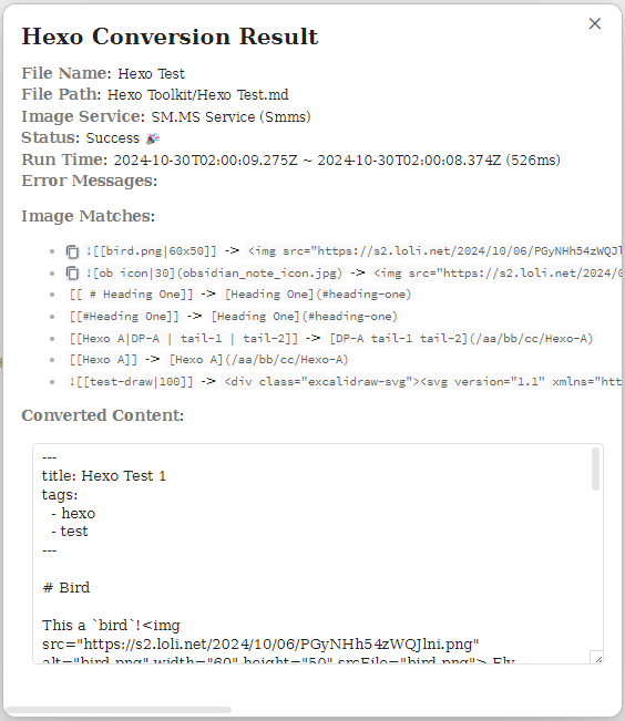 - Hexo Toolkit: Convert: This command can only be executed within Markdown notes. Running it will convert the current active note to Hexo-compatible Markdown format. During the conversion, the status bar displays the current progress. Once completed, you can click the status bar to open a "Hexo Conversion Result" window with the conversion details.