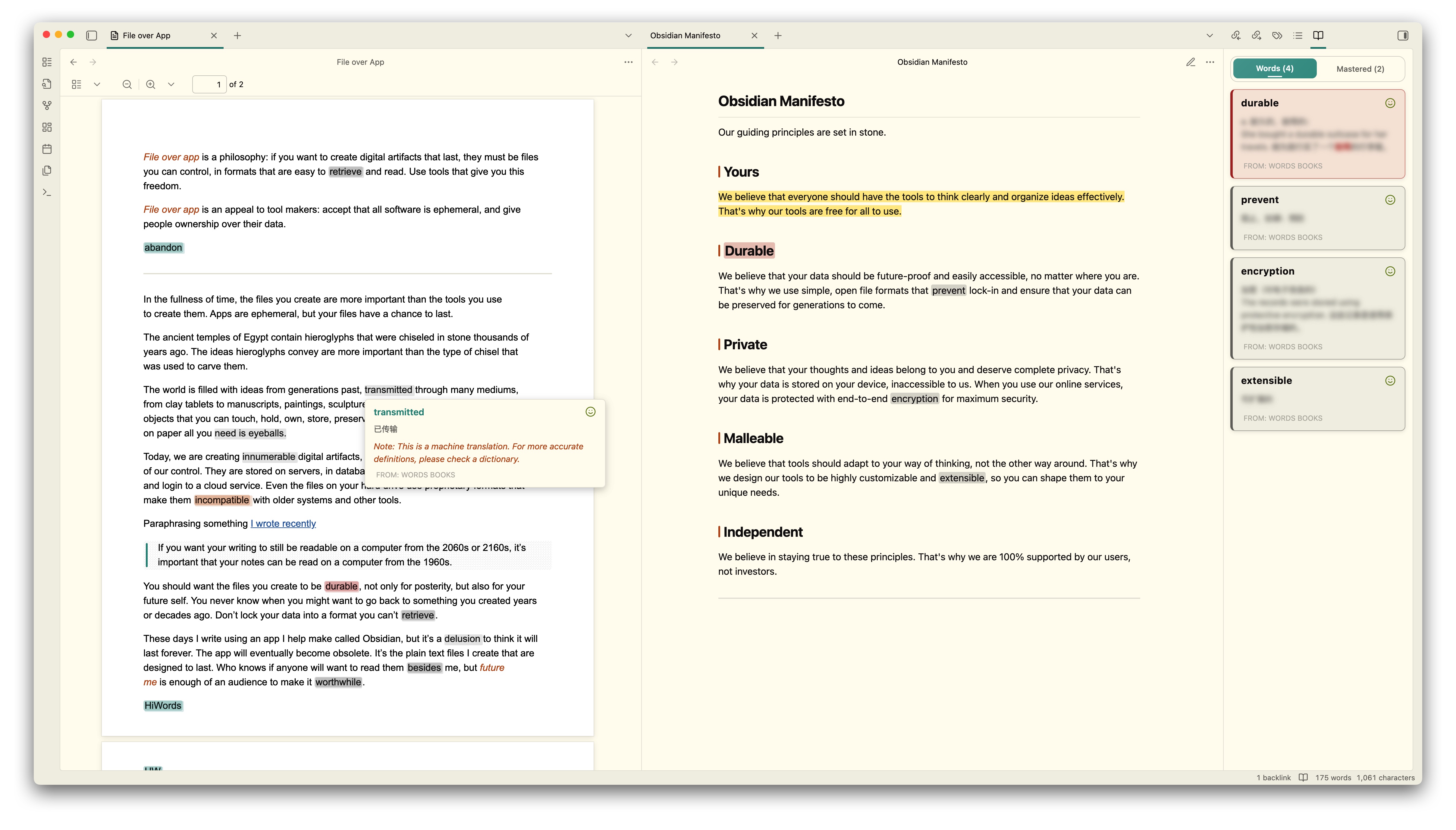 Manage your vocabulary books using Obsidian's powerful Canvas feature. You can freely arrange vocabulary cards on Canvas with drag-and-drop, create multiple independent vocabulary books for different topics, languages, or learning goals, and use node colors to categorize words by difficulty, topic, or mastery level. All changes to your vocabulary books are automatically synced and reflected in your reading highlights.