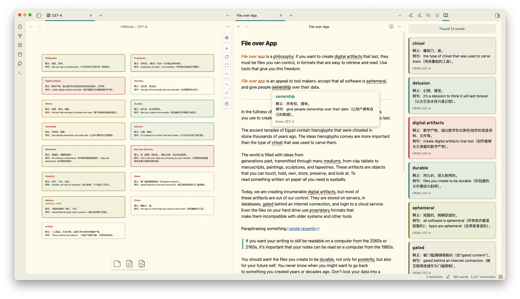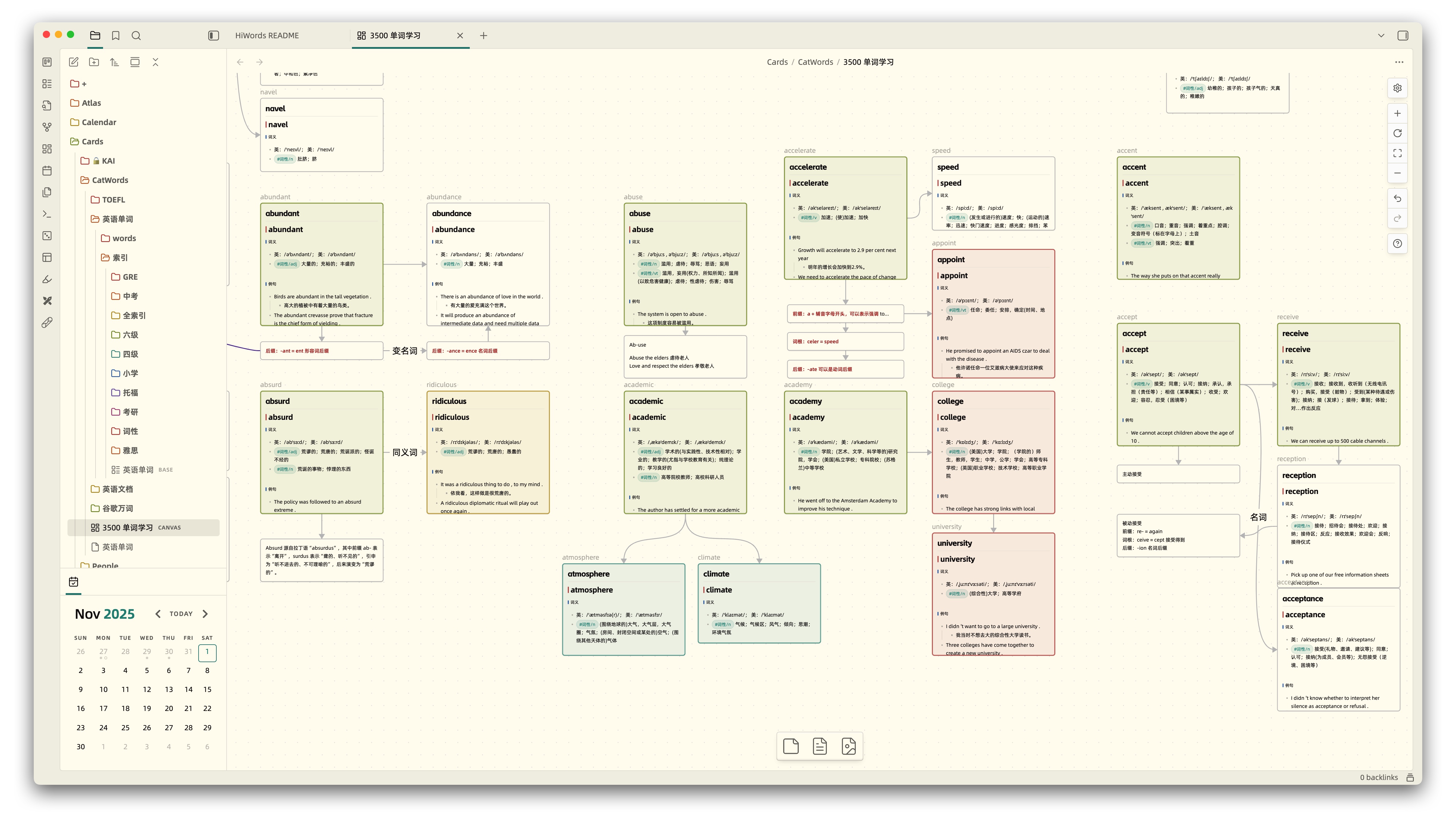 Tips: You can directly drag files into Canvas, and HiWords will automatically parse the file content and add it to your vocabulary book. Configure file node mode in HiWords settings to choose filename only or with aliases.