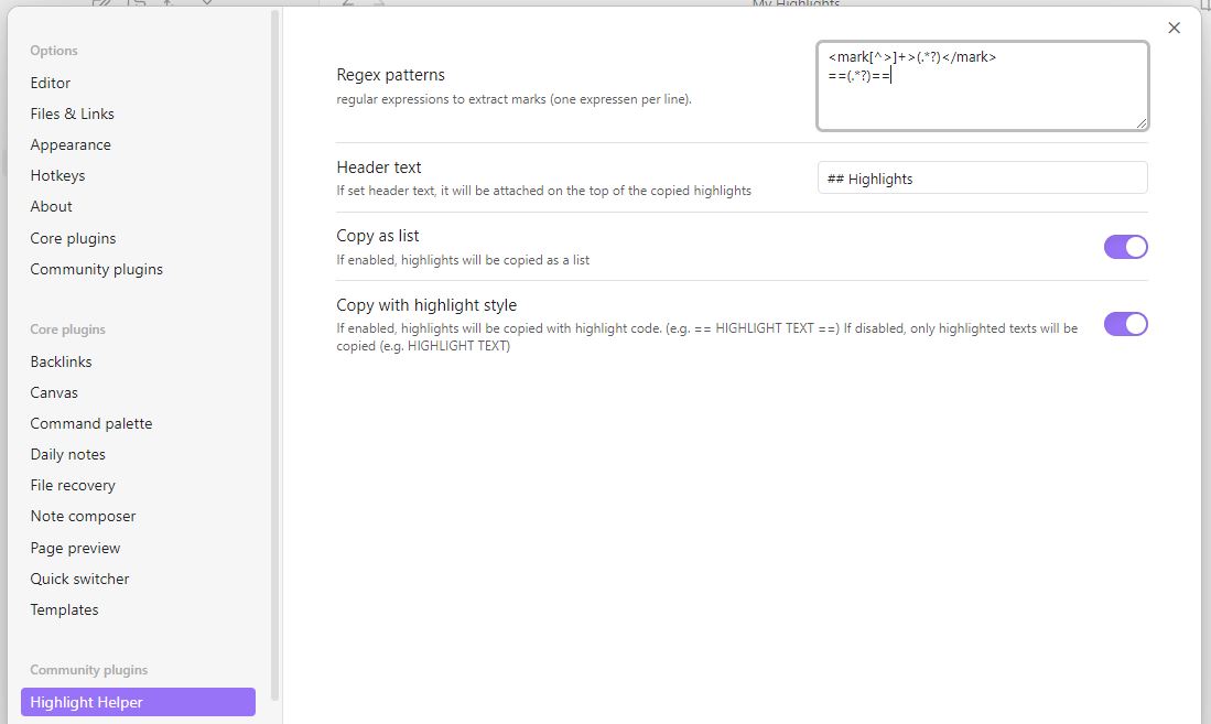 You can use your own regular expressions to collect highlights. Default values are already set for markdown highlight syntax and Highlightr Plugin.