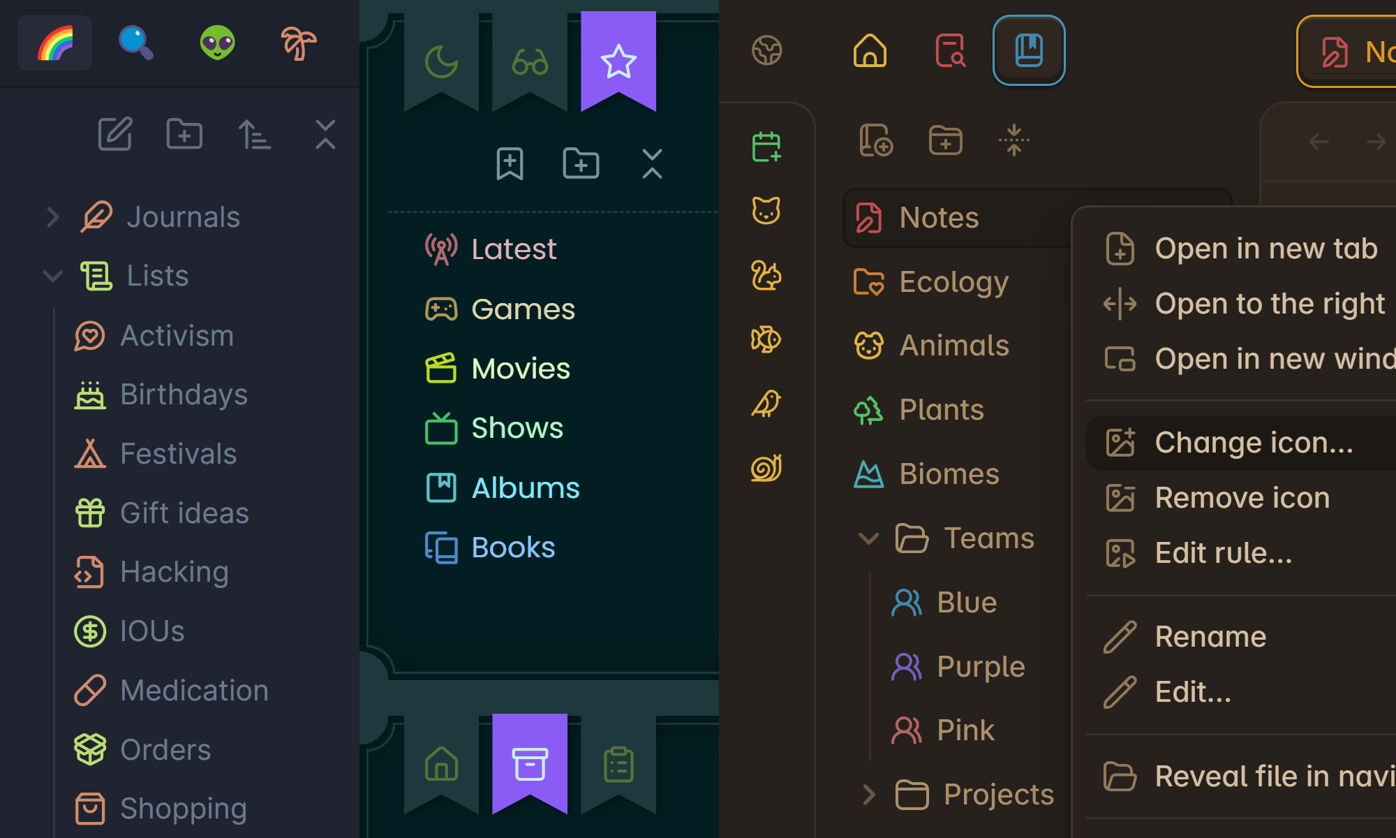Secondary-click an item whose icon you want to change, then click Change icon from the menu. You can open menus on mobile by pressing & holding an item. Certain lists like Files, Bookmarks, and Properties let you hold Alt or โง Shift to select multiple items at once.