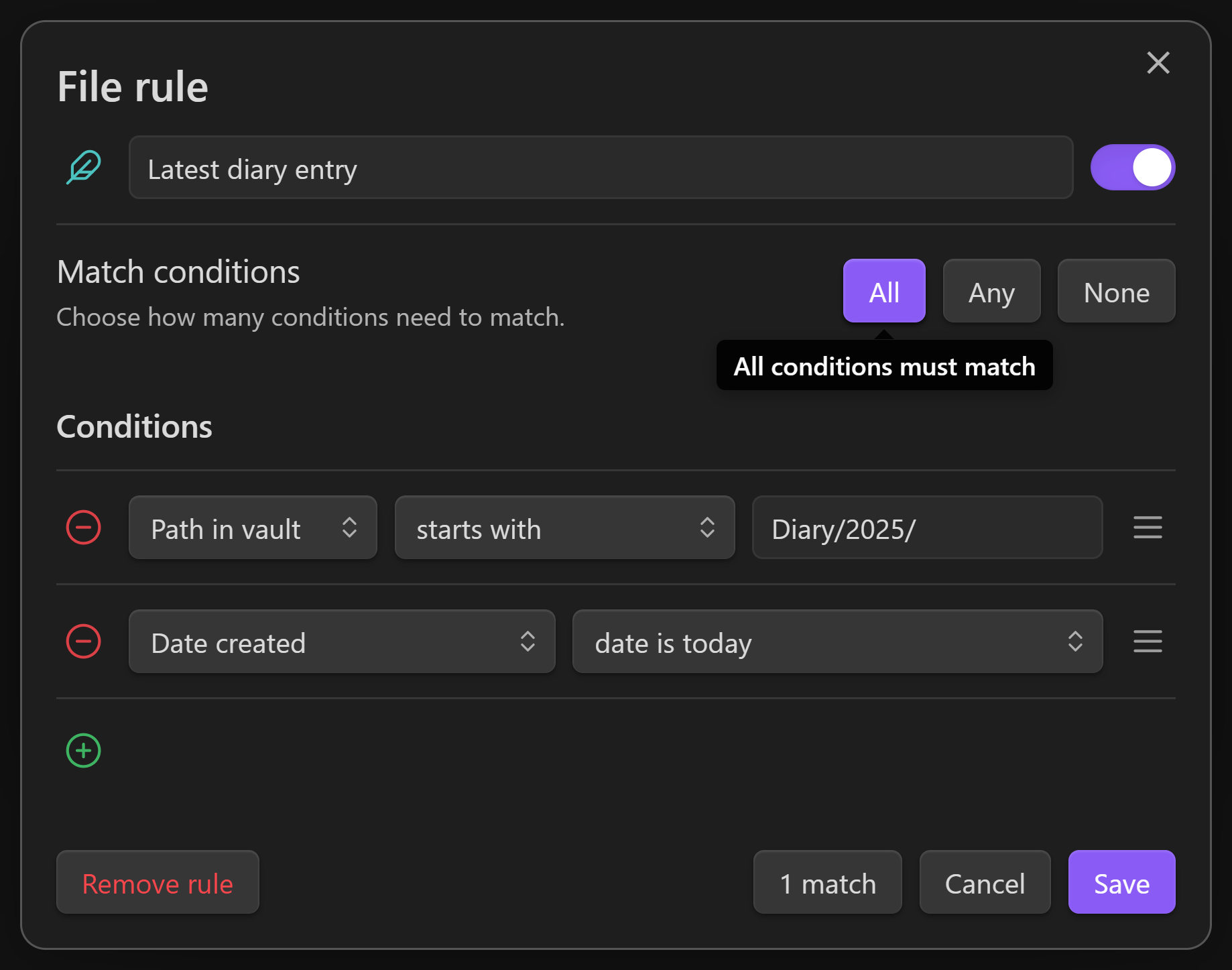 When you're using Obsidian, if your rule is overruling an icon, you can secondary-click that icon and choose Edit rule to return to this window quickly.