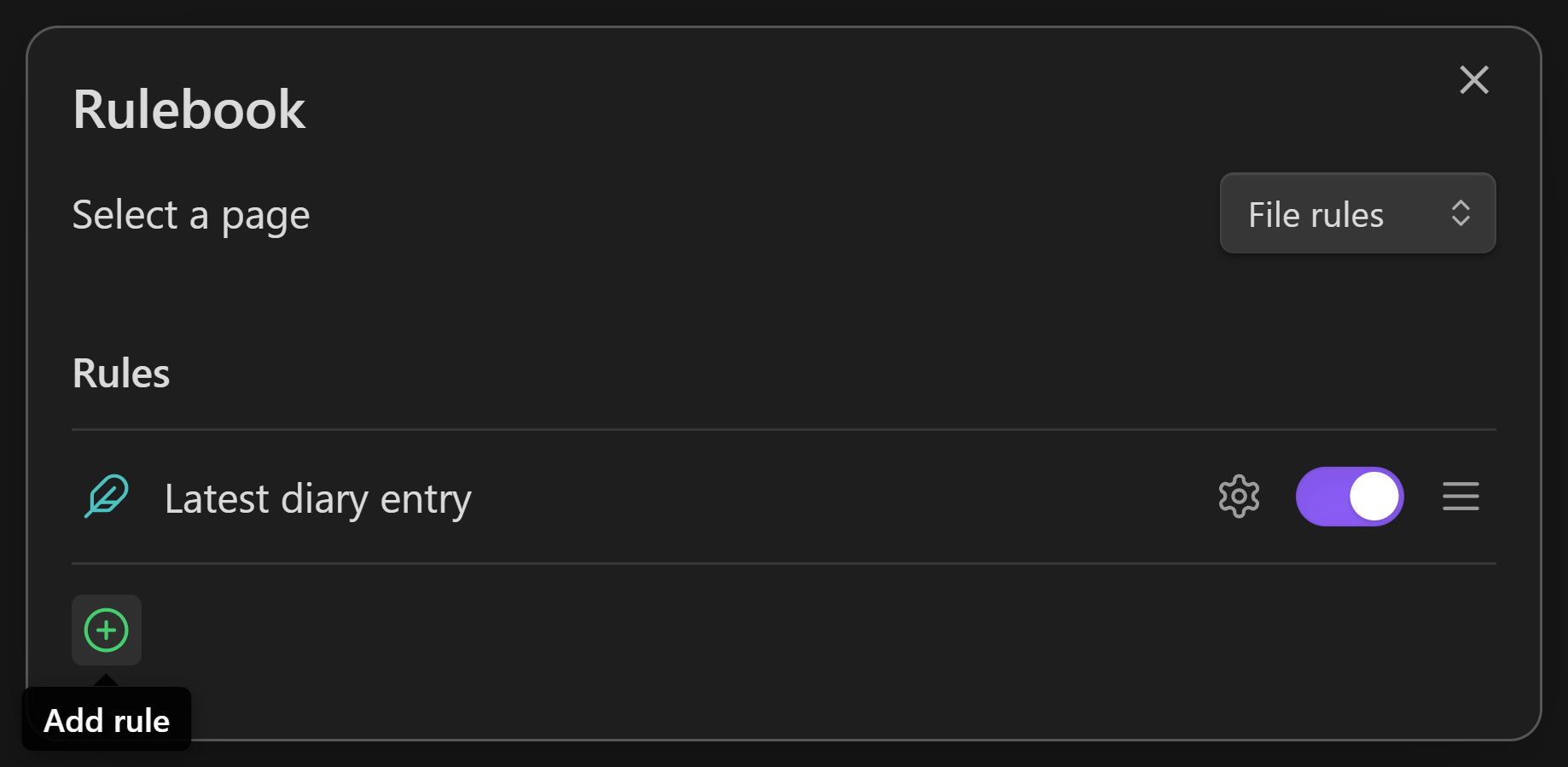 Open the rulebook from the ribbon, from the plugin settings, or by using the Open rulebook command. There are currently two pages in the rulebook: File rules and Folder rules, which affect files and folders respectively.
