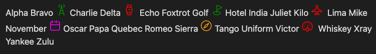 - `~![iconoir-rocket|var(--color-orange)]` Alpha Bravo Charlie Delta Echo Foxtrot Golf