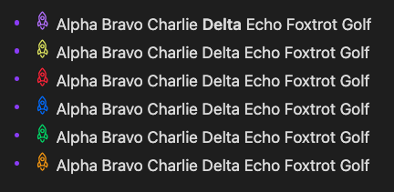 - `~![iconoir-rocket|var(--color-purple)]` Alpha Bravo Charlie Delta Echo Foxtrot Golf