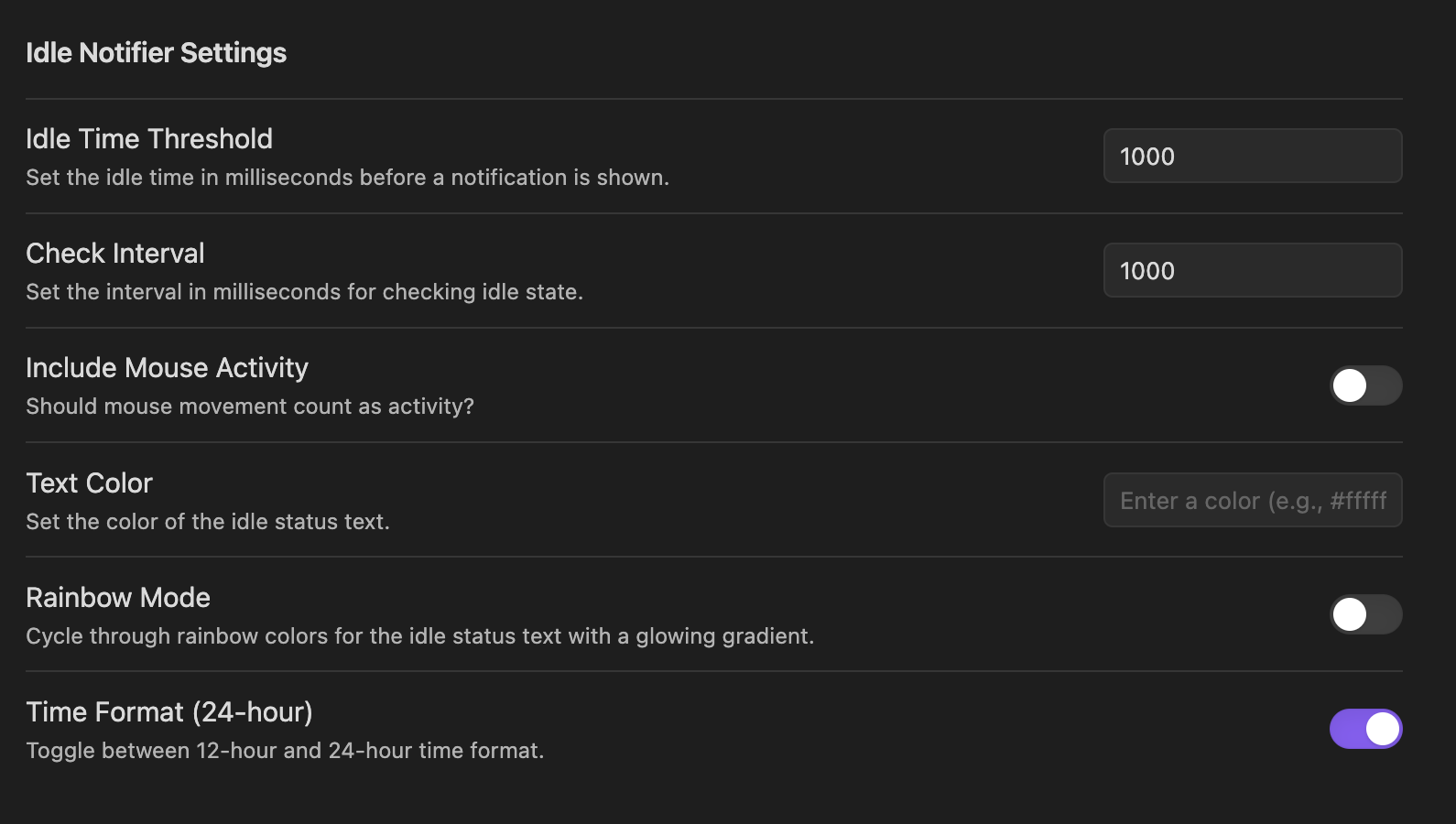 - Include Mouse Activity: Toggle whether mouse movement counts as activity.