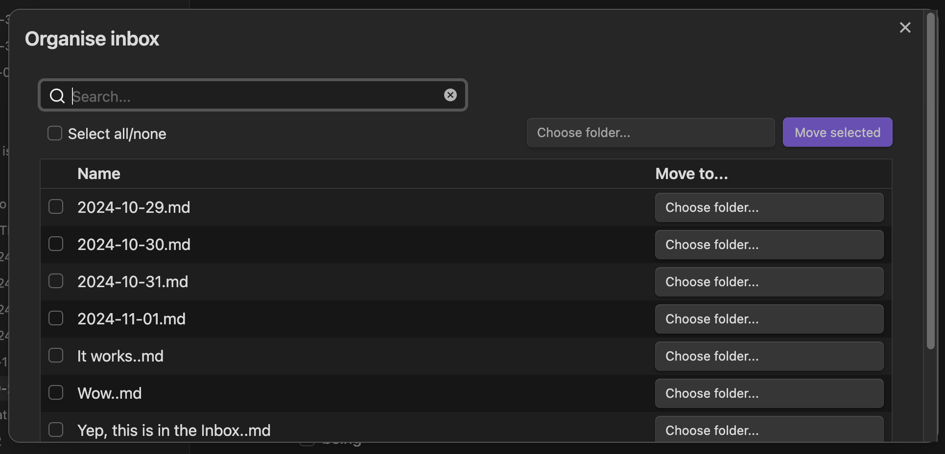 - Provides an interface to organise your inbox and move your unorganised files into other folders within your vault easily
