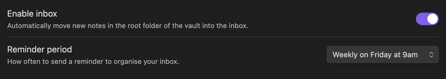 - Collects all new and unorganised notes saved into the root of your vault into an inbox folder