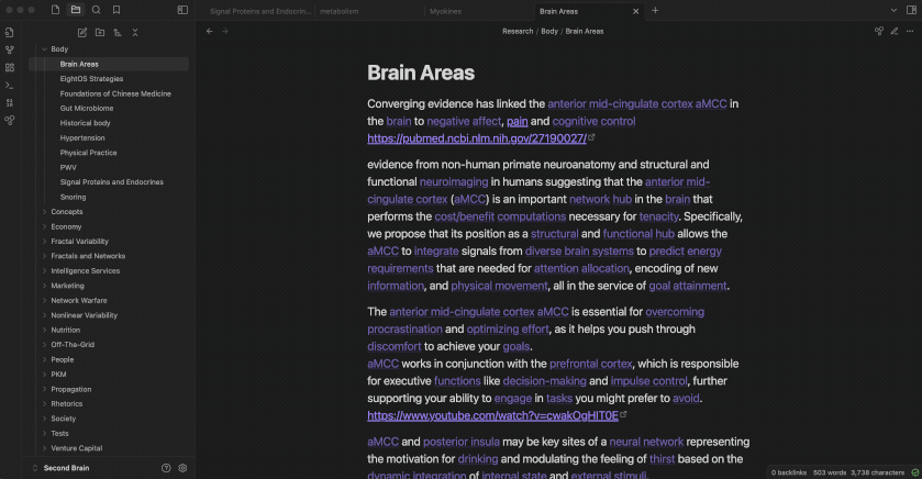 - Most interesting feature: click on the "Gaps" and see the blind holes identified in your content. These are the clusters of ideas that could be better connected. Use the built-in AI to generate interesting research questions that will help you develop the ideas in your notes further.