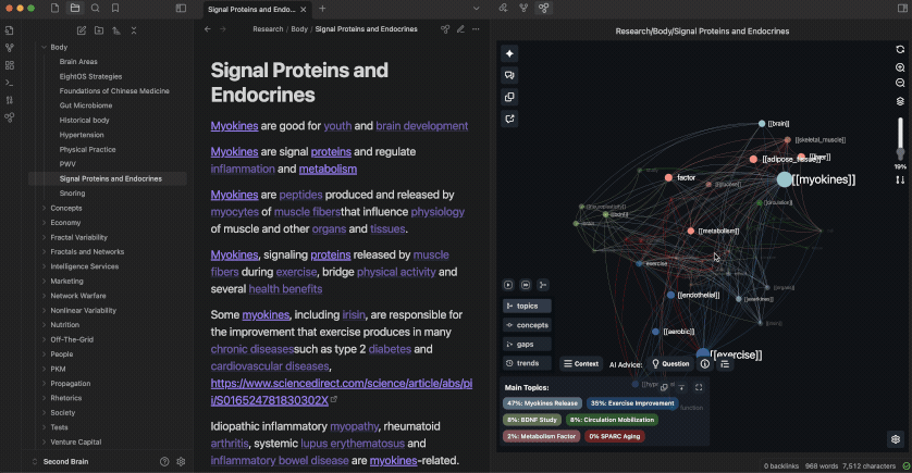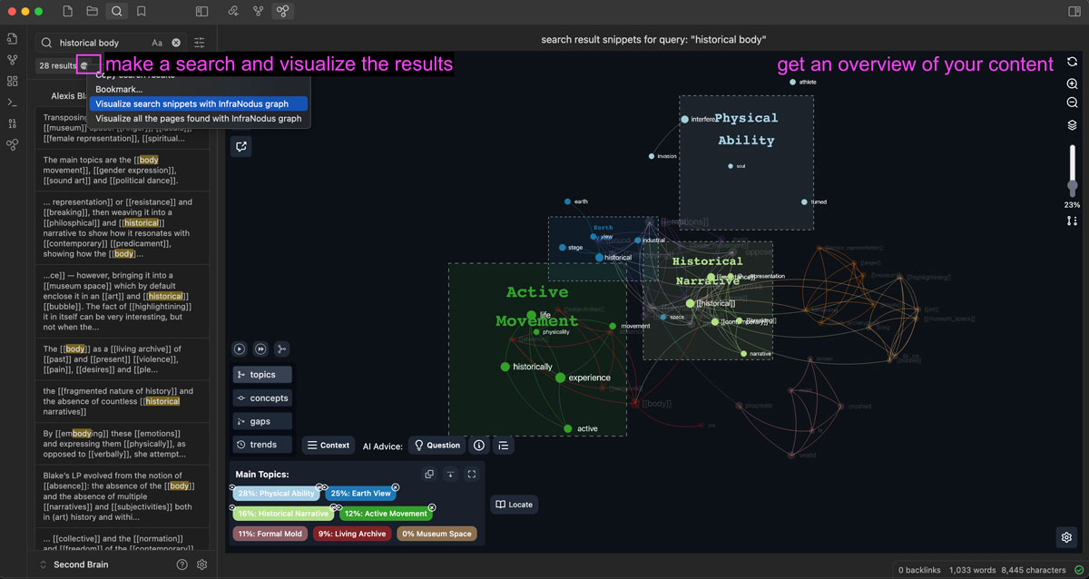 Based on InfraNodus AI text analysis and visualization tool, this plugin visualizes the content of Obsidian vaults as a knowledge graph, retrieves the main topical clusters, most important ideas, and identifies the gaps between them.