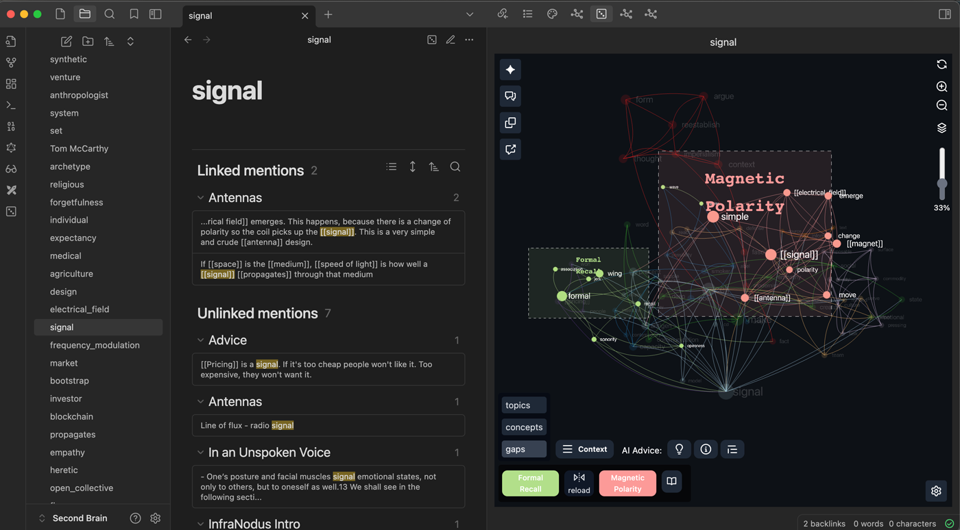 Our default graph view is more detailed and shows connections between the concepts in your text and also between the [[backlinks]] mentioned in the same statements. We find this approach works much better for ideation and mimicks the way our brain thinks (following the landscape reading model). You can read more in our article on how InfraNodus is different from Obsidian.