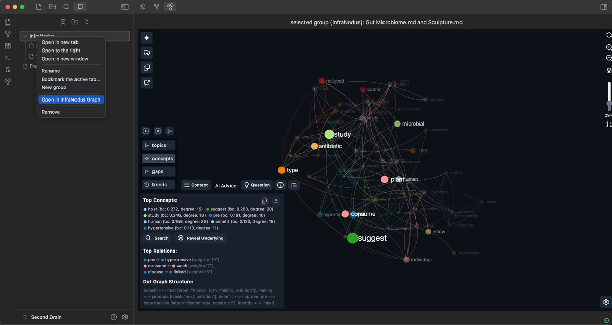 Selected files: select the files, right click, choose "InfraNodus Graph"