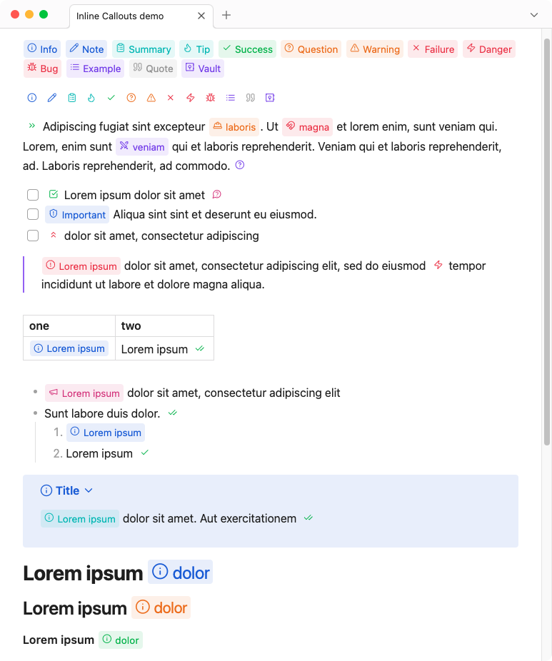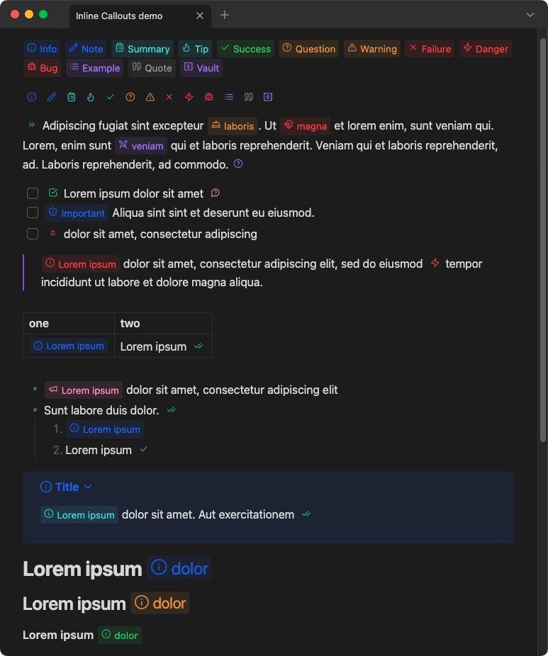 A plugin for displaying inline "callouts" in Obsidian.md; a successor to the Badges plugin by the same author. Key differences: simpler syntax, access to all Lucide icons in Obsidian, modal interfaces for icon suggestions, new inline callout and modify inline callout.